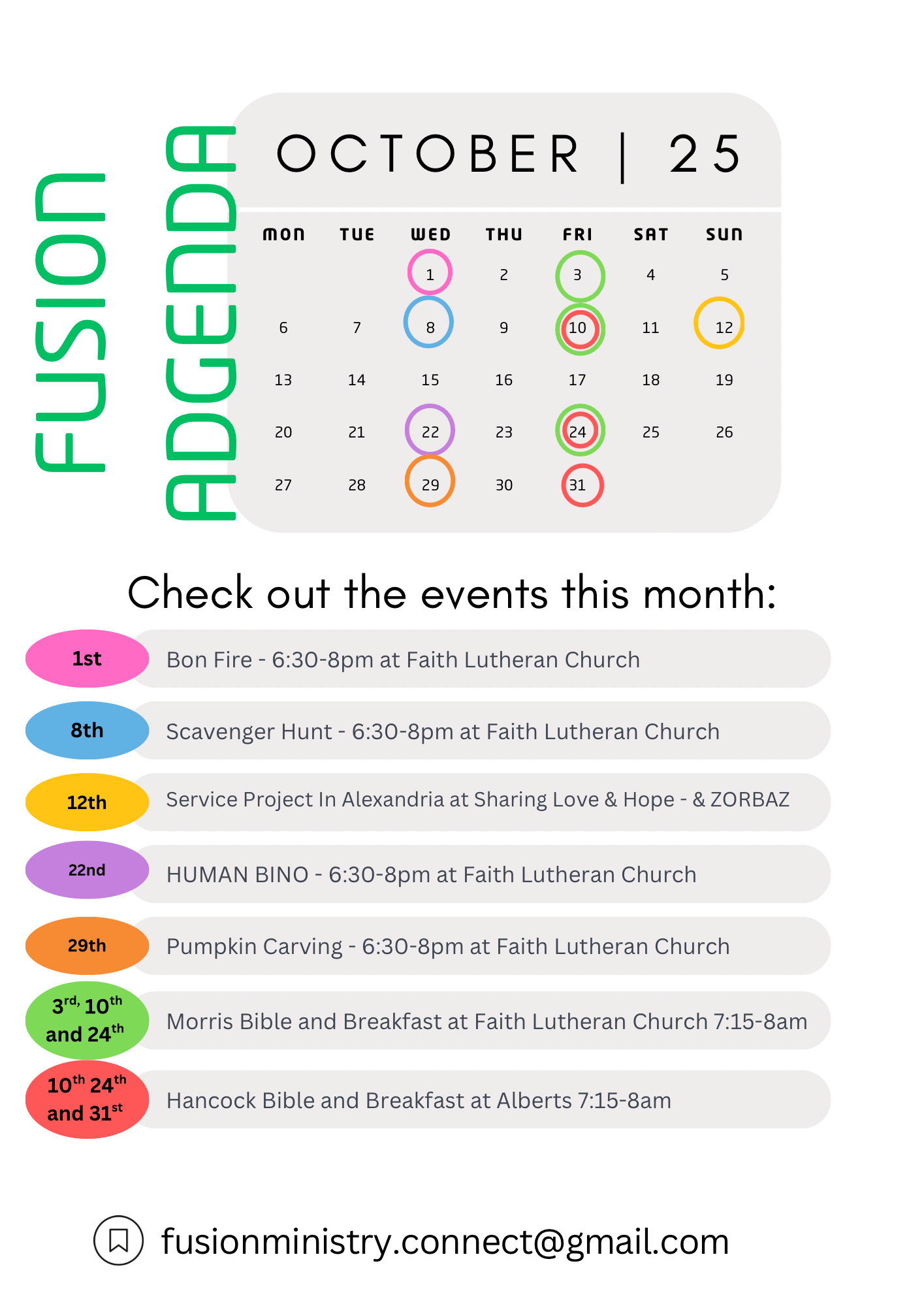 Sr. High Fusion is gathering of youth from the Morris area AGES 9th-12th Grades. We meet Wednesdays from 7-8:30pm at First Lutheran Church. All are welcome to come regardless of what school you attend, what church you go to or even if you don’t attend a church.