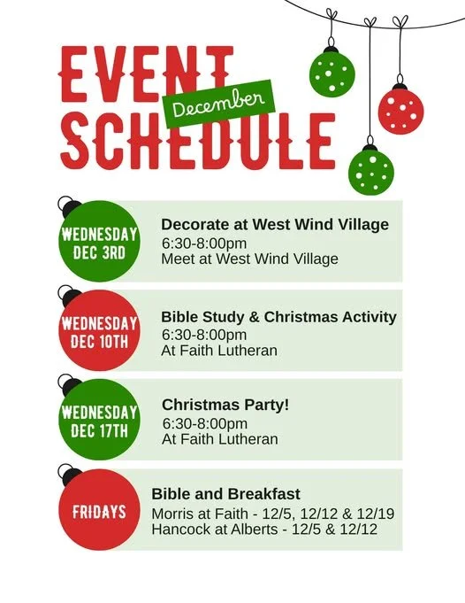 Let’s start our Friday off right. Meet up at Faith Lutheran Church @7:15am. It’s make your own pancakes! Eat some yummy breakfast - listen to a short devotional and then head off to school! Reach out if you need a ride!